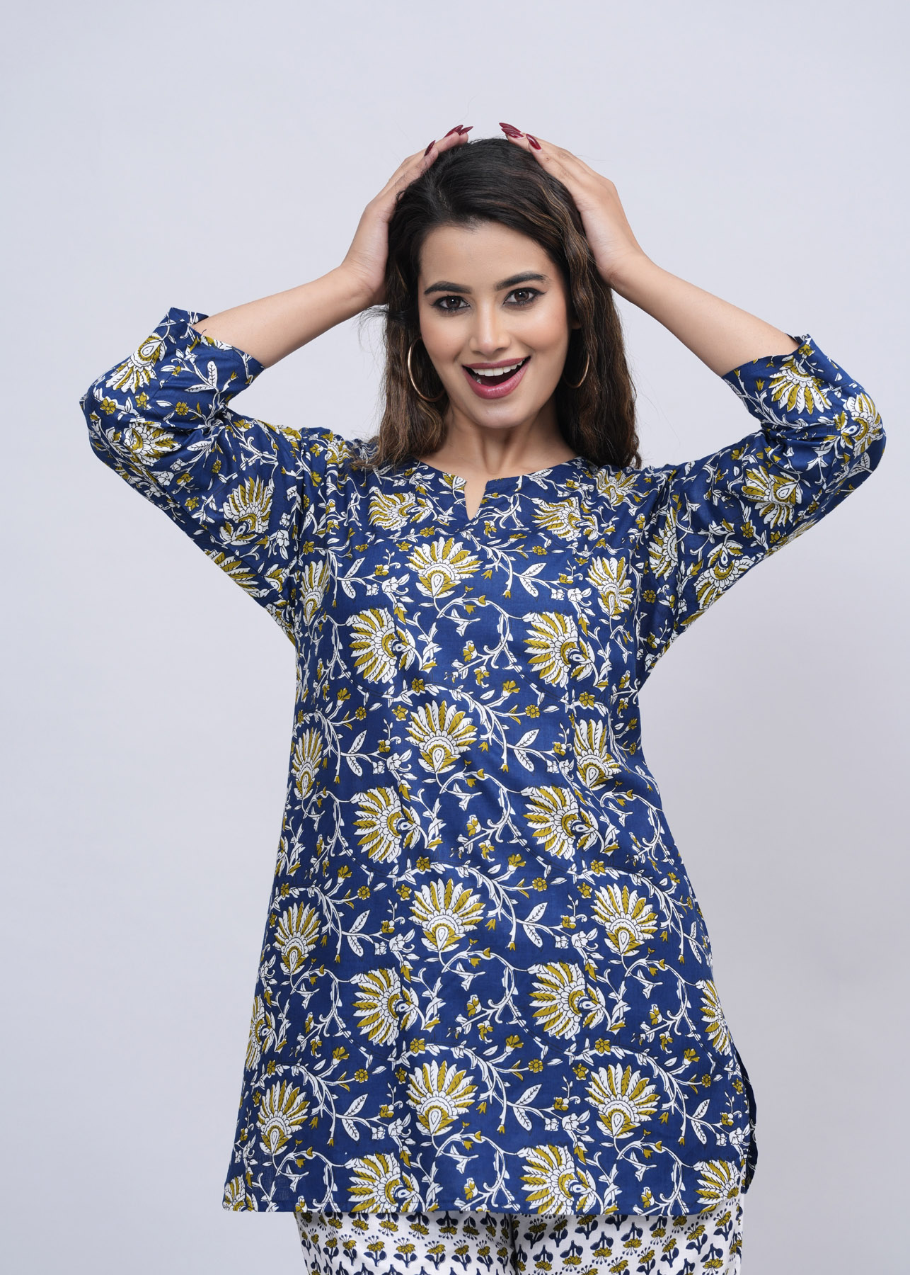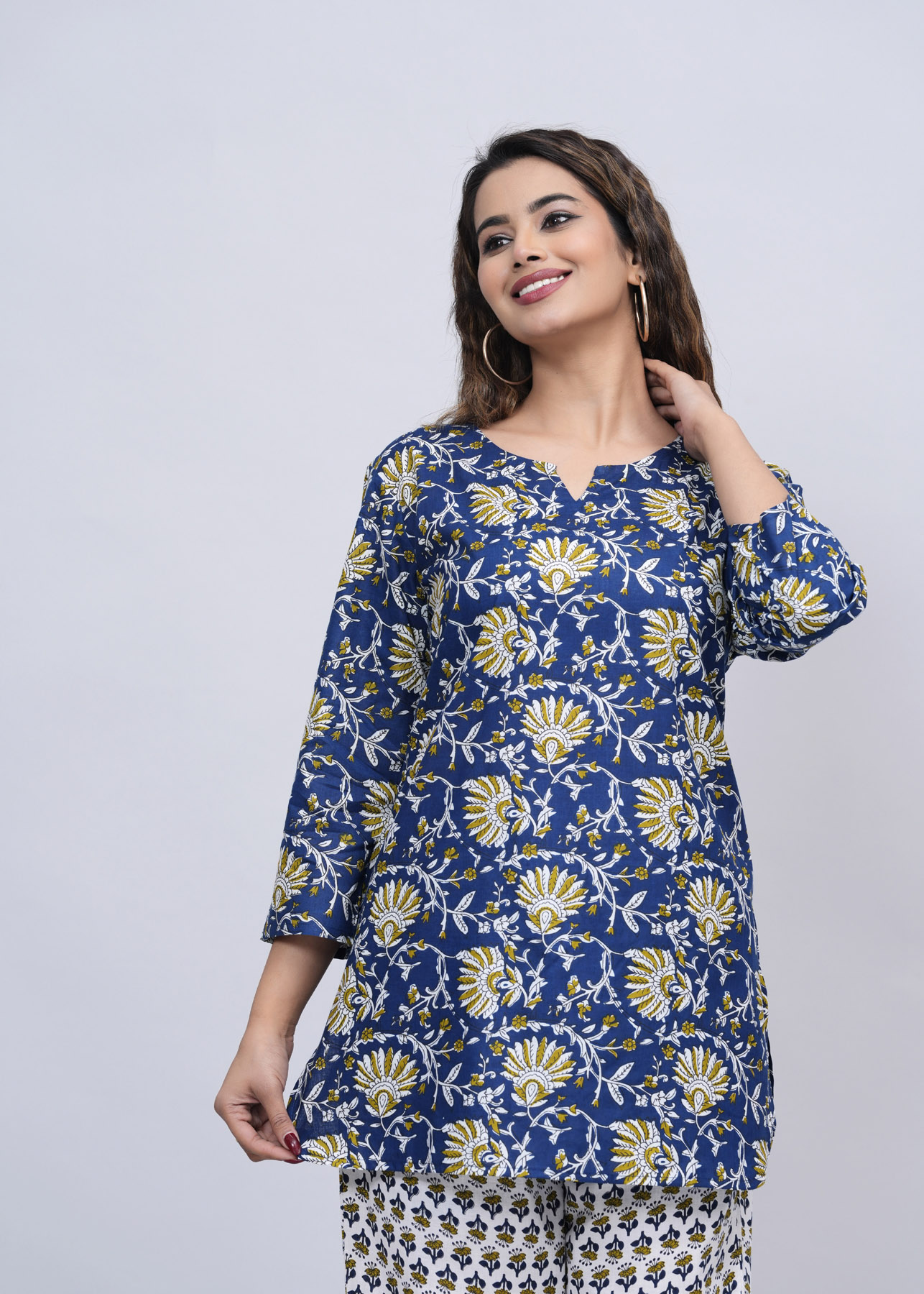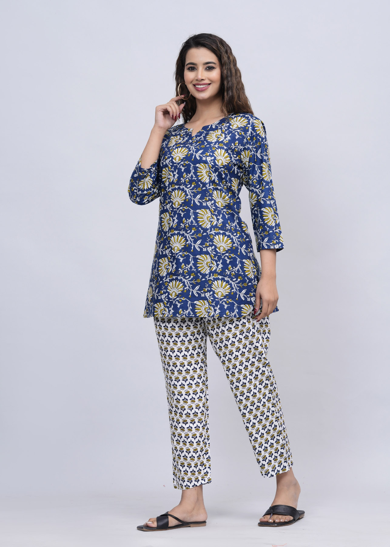 This night suit and top combo is designed to keep you up to date with work, casual, and high fashion. It is based on the most recent trends. It will provide you with comfort throughout the day. One of the wear’s main features is its exquisite design. It always looks amazing when paired with matching accessories. This multicolored, straight cotton nightgown and top set with flower design work are ideal for casual use every day. The product features 3/4-length sleeves and a banded Notch collar neck. Because it is made of cotton, this set is cozy to wear.