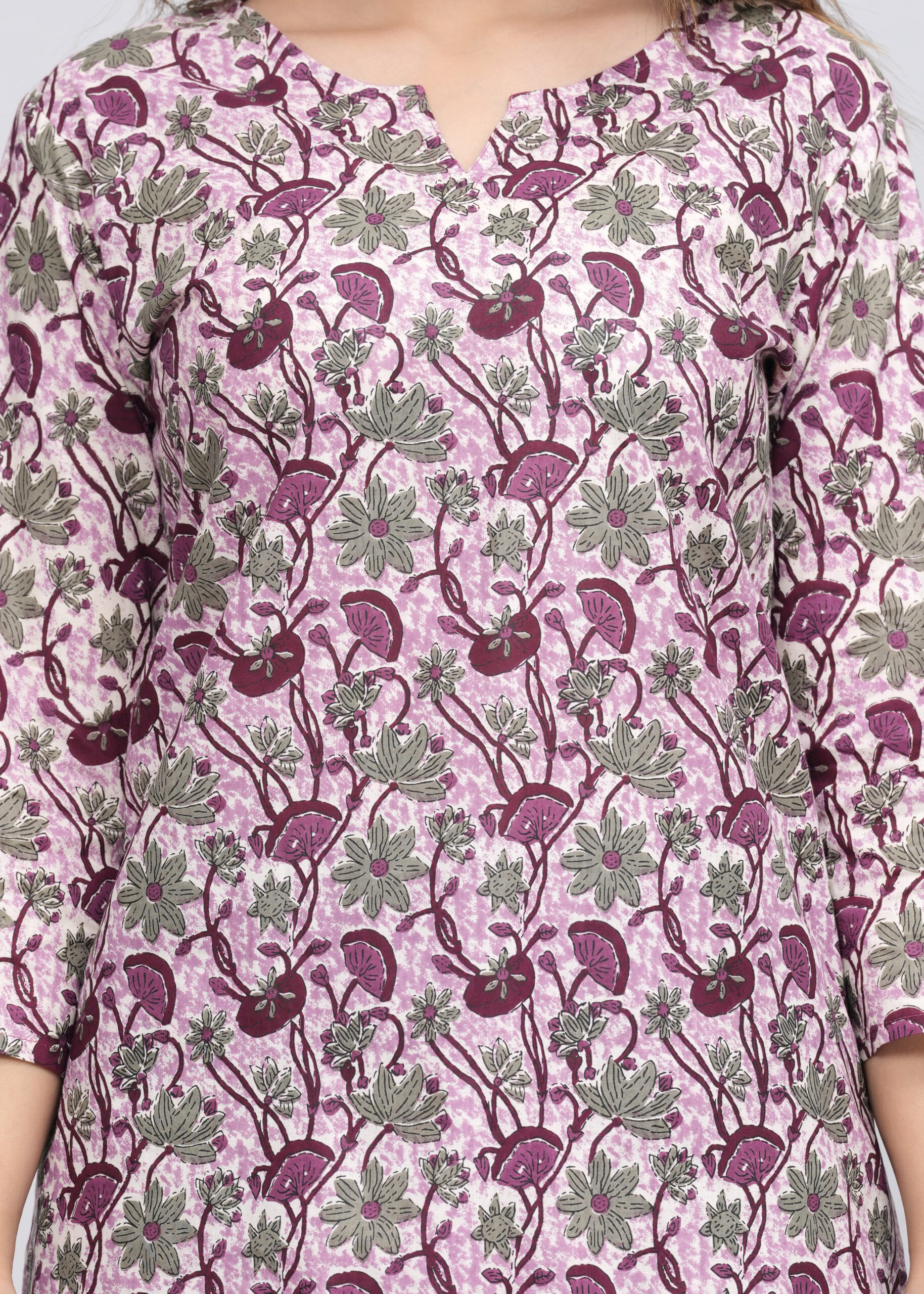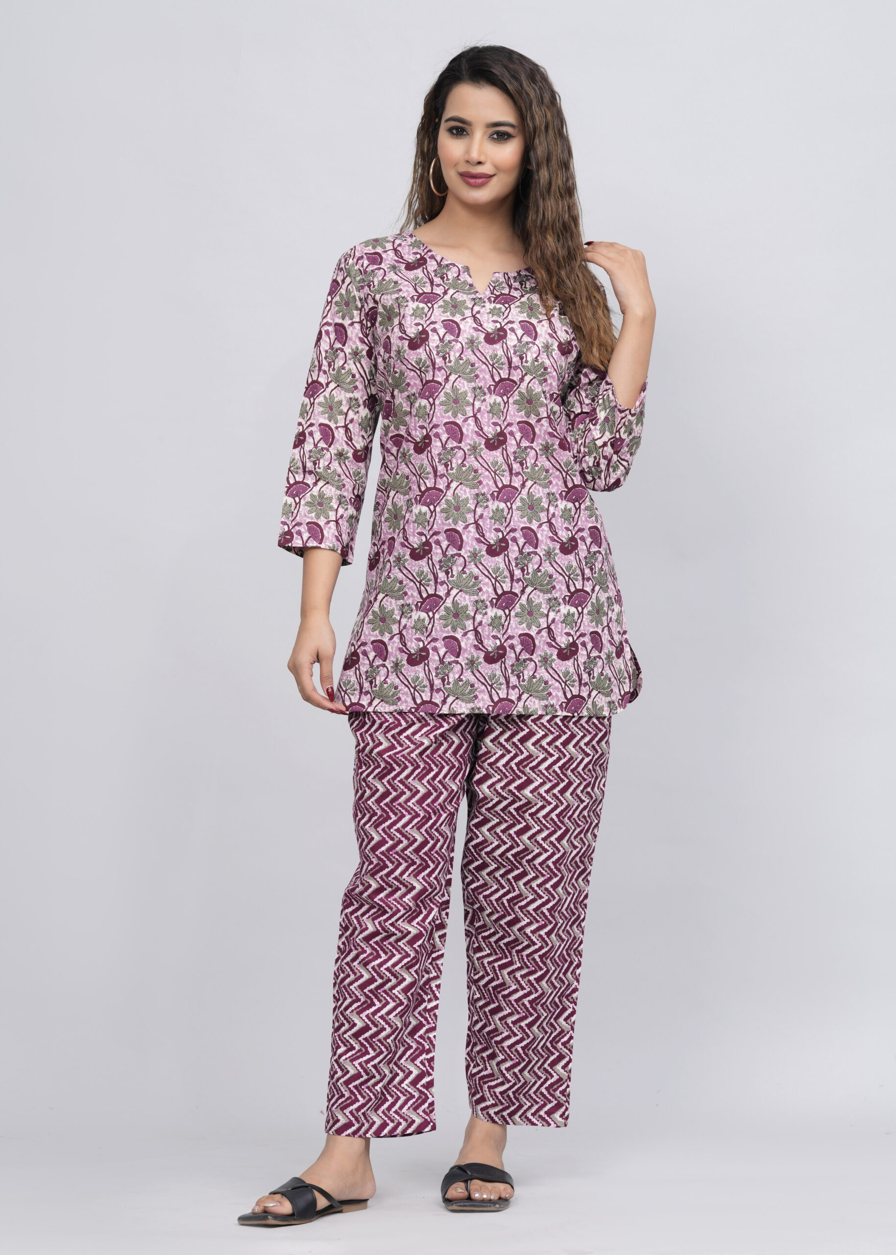 This night suit and top combo is designed to keep you up to date with work, casual, and high fashion. It is based on the most recent trends. It will provide you with comfort throughout the day. One of the wear’s main features is its exquisite design. It always looks amazing when paired with matching accessories. This multicolored, straight cotton nightgown and top set with flower design work are ideal for casual use every day. The product features 3/4-length sleeves and a banded Notch collar neck. Because it is made of cotton, this set is cozy to wear.