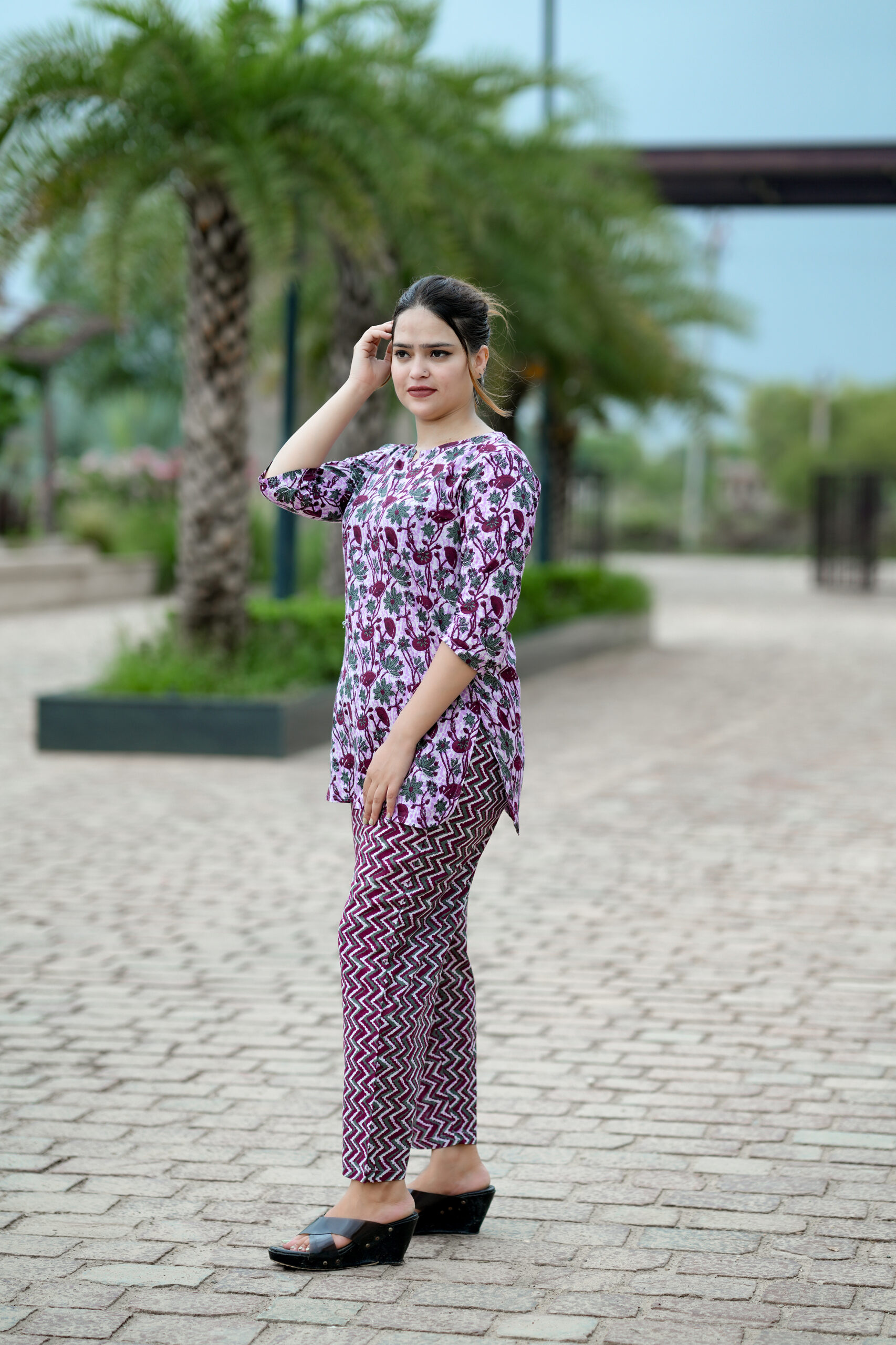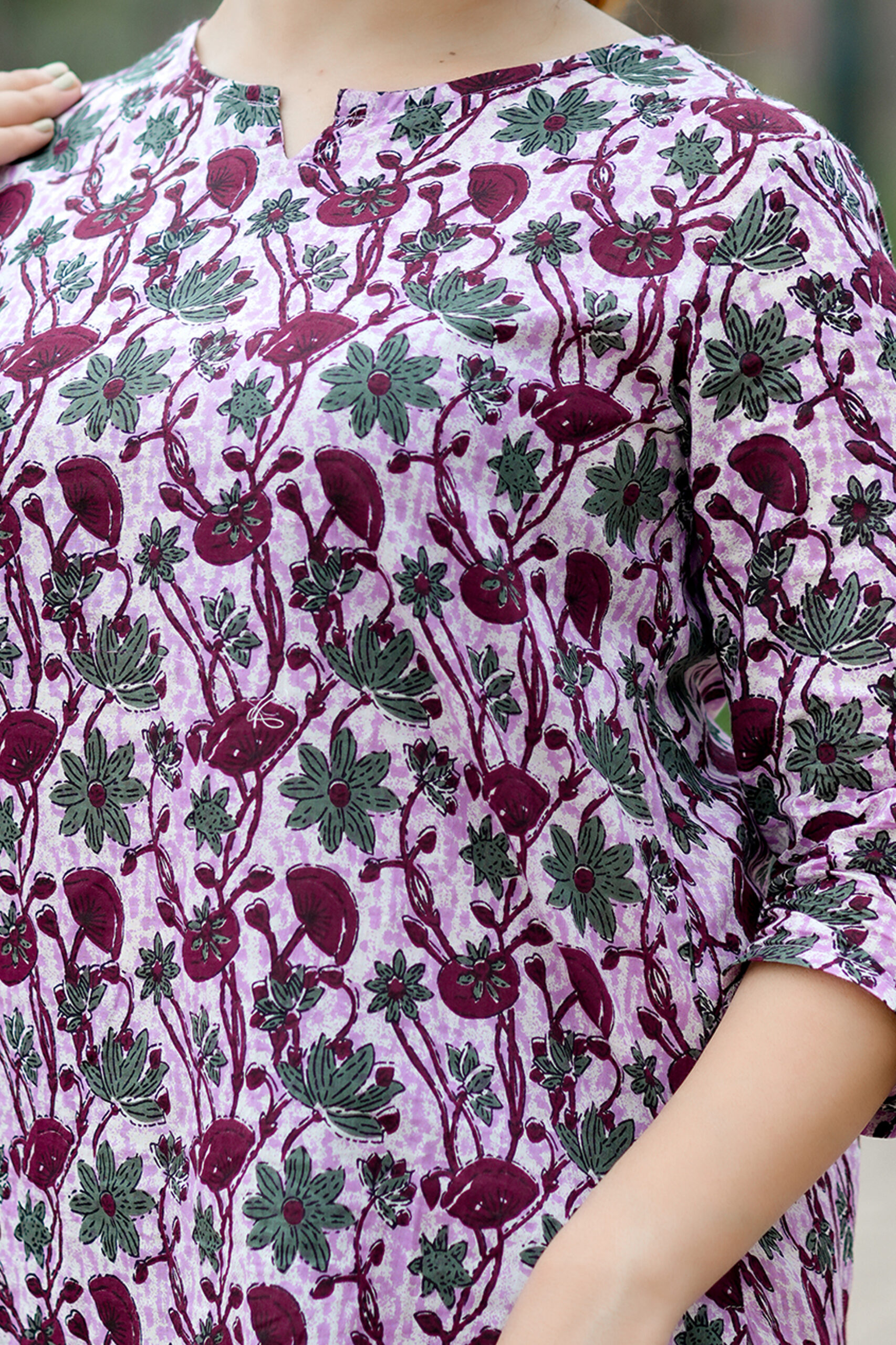 This night suit and top combo is designed to keep you up to date with work, casual, and high fashion. It is based on the most recent trends. It will provide you with comfort throughout the day. One of the wear’s main features is its exquisite design. It always looks amazing when paired with matching accessories. This multicolored, straight cotton nightgown and top set with flower design work are ideal for casual use every day. The product features 3/4-length sleeves and a banded Notch collar neck. Because it is made of cotton, this set is cozy to wear.